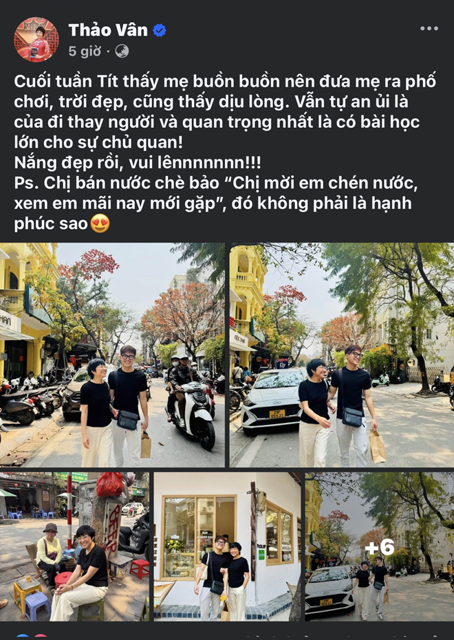 Để giúp mẹ thư giãn và nhanh chóng quên đi sự việc không mong muốn, bé Tít đã đưa cô ra phố đi dạo. Nữ MC cho biết, nhờ thời tiết đẹp và sự quan tâm của con trai, cô cảm thấy nhẹ nhõm hơn.