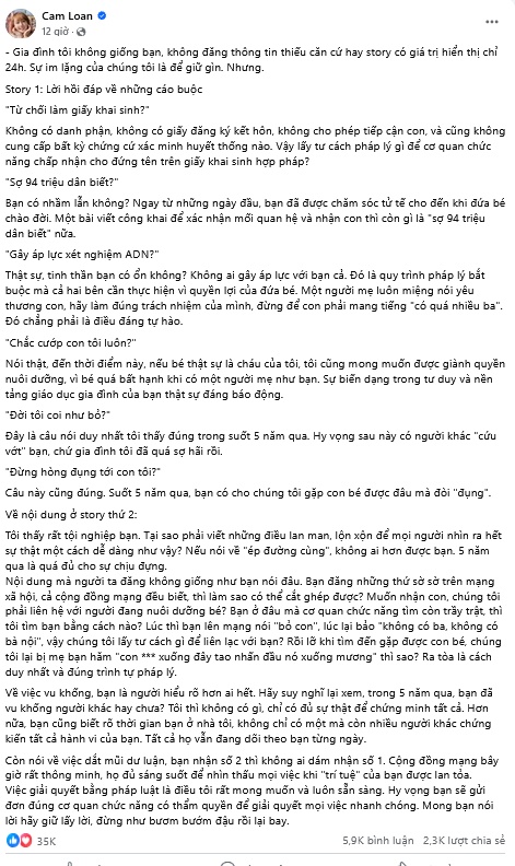 "Nội dung mà người ta đăng không giống như bạn nói đâu. Bạn đăng những thứ sờ sờ trên mạng xã hội, cả cộng đồng mạng đều biết, thì làm sao có thể cắt ghép được? Muốn nhận con, chúng tôi phải liên hệ với người đang nuôi dưỡng bé? Bạn ở đâu mà cơ quan chức năng tìm còn trầy trật, thì tôi tìm bạn bằng cách nào? Lúc thì bạn lên mạng nói "bỏ con", lúc lại bảo "không có ba, không có bà nội", vậy chúng tôi lấy tư cách gì để liên lạc với bạn? Rồi lỡ khi tìm đến gặp được con bé, chúng tôi lại bị mẹ bạn hăm "con *** xuống đây tao nhấn đầu nó xuống mương" thì sao? Ra tòa là cách duy nhất và đúng trình tự pháp lý.