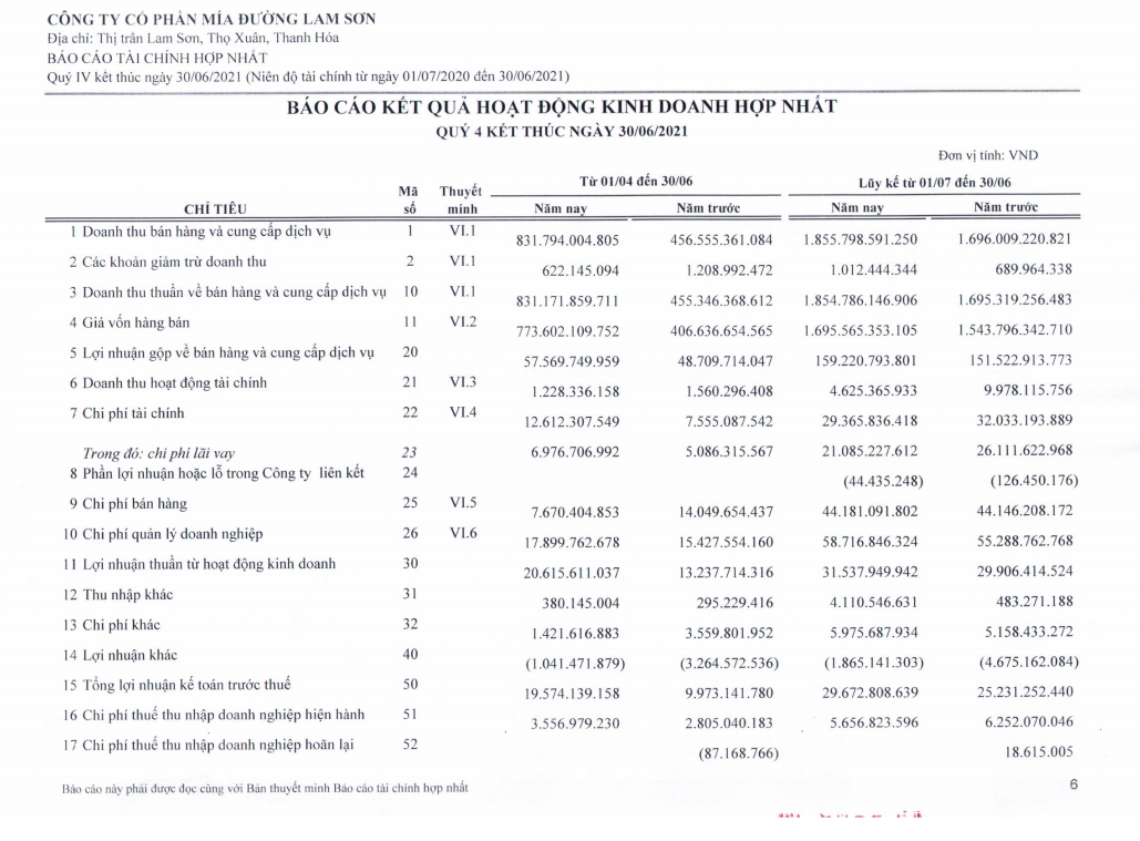 Kết quả kinh doanh niên độ tài chính kế toán từ 1/7/2020 đến 30/6/2021 của Mía đường Lam Sơn.