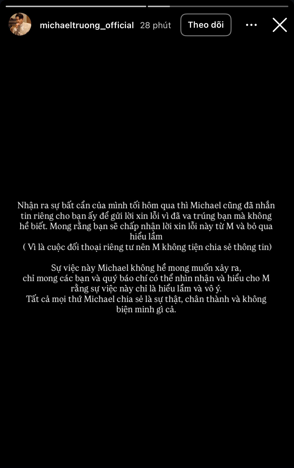 Michael chỉ mong muốn tất cả mọi người đều vui vẻ, không ai khó xử với ai, mong rằng mọi người sẽ hiểu cho những gì Michael đang chia sẻ còn nếu không thì Michael cũng không biết nói gì hơn vì câu chuyện sự thật không phải là như vậy".