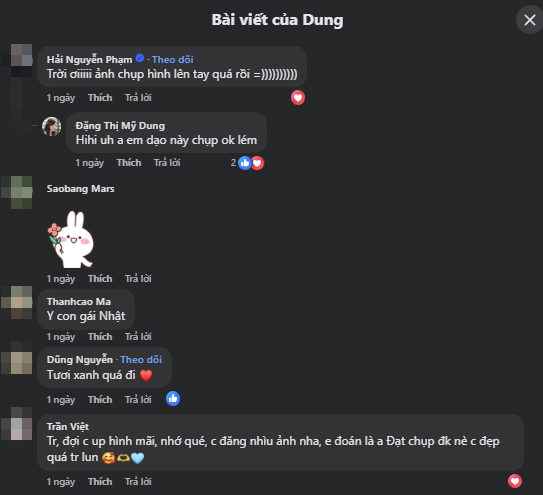 "Trời ơi, anh ấy chụp ảnh lên tay quá rồi", một người bạn bày tỏ. Đáp lại, Midu cũng tự hào khoe chồng: "Ừ, dạo này anh chụp ok lắm rồi".