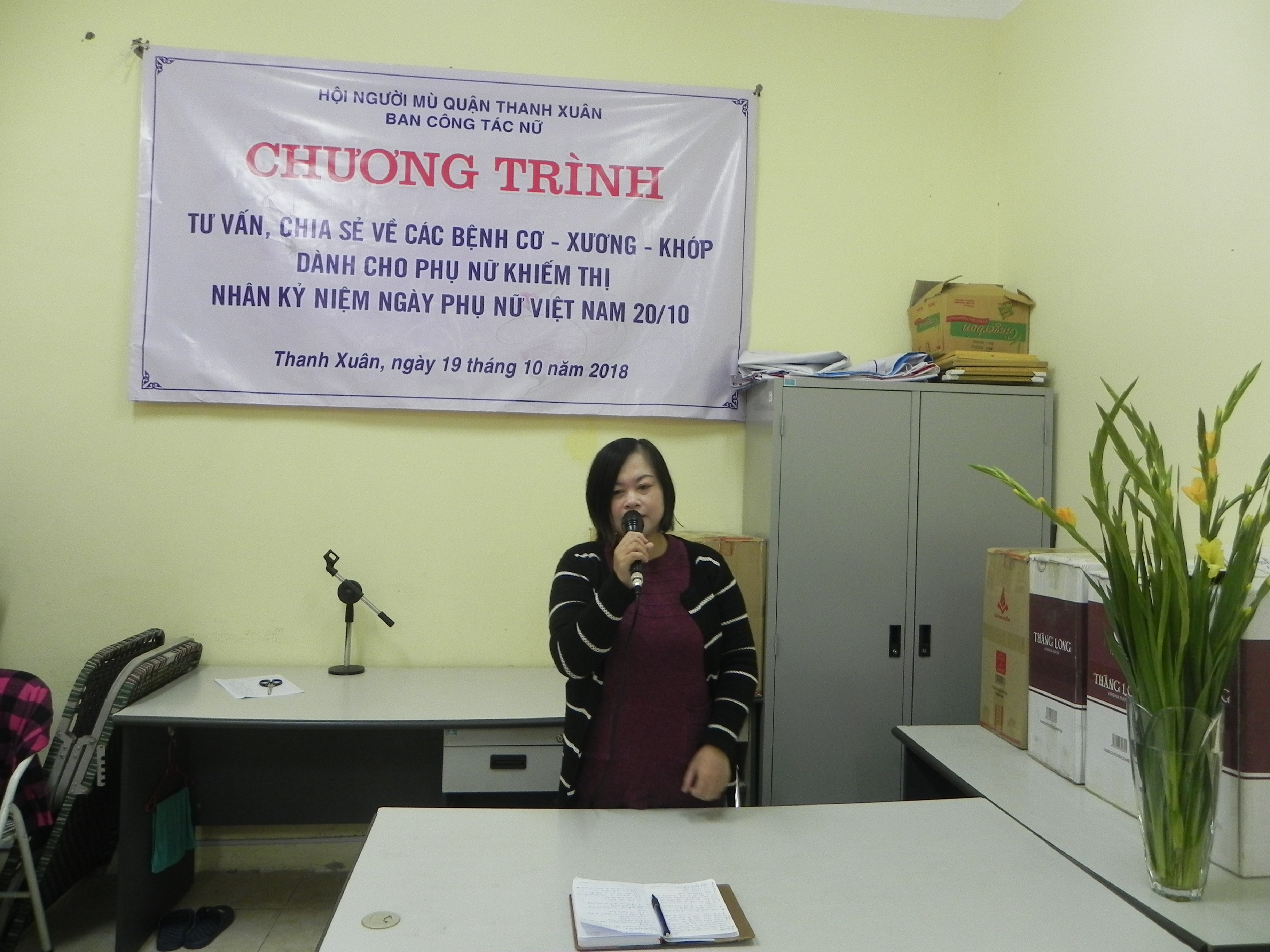 Ngày 19/10, Hội Người mù quận Thanh xuân, Hà Nội phối hợp với Công ty CP Đào tạo Spa dưỡng sinh Tina Đỗ tổ chức Chương trình tư vấn, chia sẻ về các bệnh cơ xương khớp; tặng quà phụ nữ khiếm thị nhân kỷ niệm Ngày thành lập Hội Liên hiệp Phụ nữ Việt Nam 20/10.