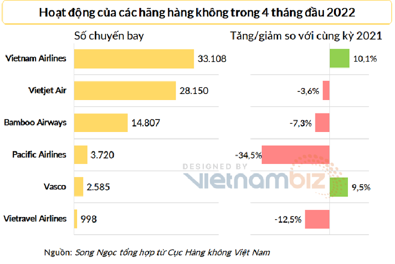 Số chuyến bay của Vietjet trong 4 tháng đầu 2022 giảm nhẹ so với 4 tháng đầu 2021 nhưng cao gấp nhiều lần 7 tháng cuối năm 2021 khi COVID-19 tái bùng phát.