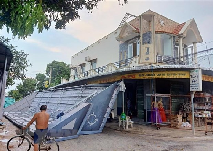 Nhiều căn nhà bị giật tung mái hất ra đường, nhiều cây xanh bị quật ngã, tường đổ sập, tài sản bị mưa ướt hư hỏng… Trong đó một số căn nhà bị gió mất toàn bộ mái, tôn bị gió cuốn văng xa hàng chục mét.