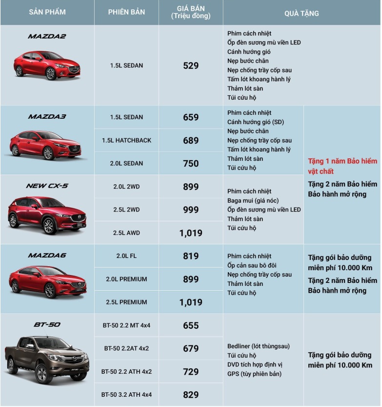 Ngoài ra, Mazda Việt Nam vẫn tiếp tục thực hiện chương trình ưu đãi miễn phí phụ kiện, miễn phí 02 năm Bảo hiểm bảo hành mở rộng và miễn phí bảo dưỡng 10.000 km (tuỳ từng mẫu xe cụ thể) nhằm tạo điều kiện tốt nhất cho khách hàng đang mong muốn sở hữu những mẫu xe Mazda đang được yêu thích hiện nay.