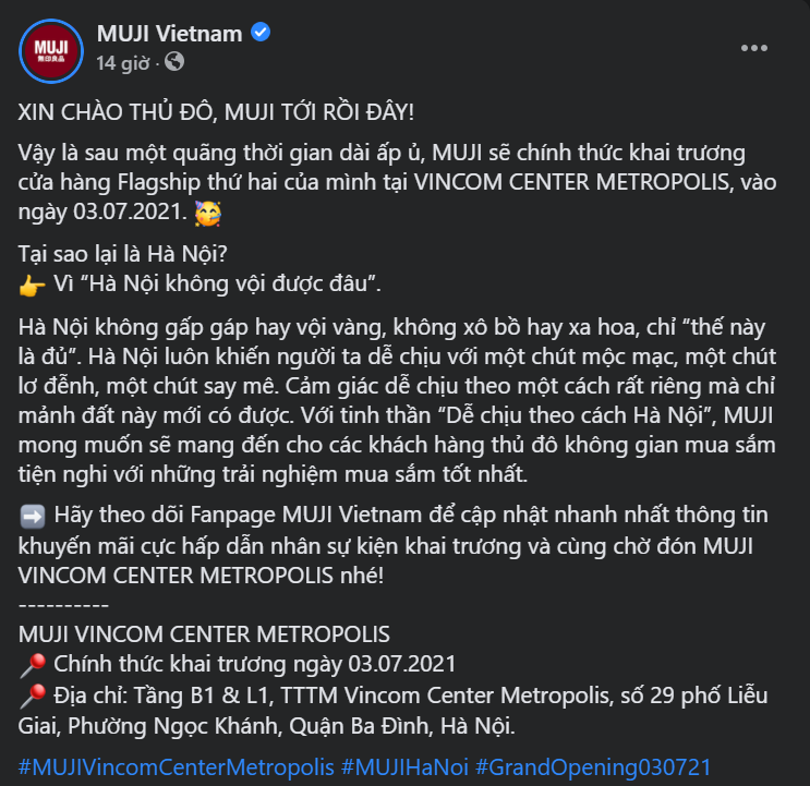 Mới đây, trên trang Fanpage chính thức, Muji Việt Nam thông báo sẽ khai trương cửa hàng flagship tại Vincom Center Metropolis (số 29 Liễu Giai, Quận Ba Đình, Hà Nội), vào ngày 3/7 tới đây.