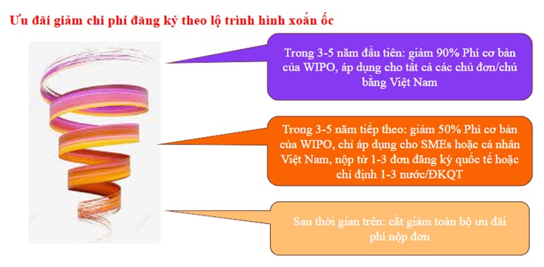 Tiếp theo, trong 3 đến 5 năm sau đó, mức ưu đãi giảm 50% sẽ được áp dụng riêng cho các doanh nghiệp nhỏ và vừa (SMEs) hoặc cá nhân có số lượng đơn đăng ký hạn chế. Sau giai đoạn ưu đãi, mức phí sẽ được điều chỉnh trở lại theo biểu phí chuẩn. Đề xuất giảm 90% phí trong 3 năm đầu được bà Lê Phương Thảo (Misha), Giám đốc Sở hữu Trí tuệ Bình Minh (Sunrise IP), nhấn mạnh như một cú hích cần thiết để SMEs Việt tiến ra thị trường quốc tế.