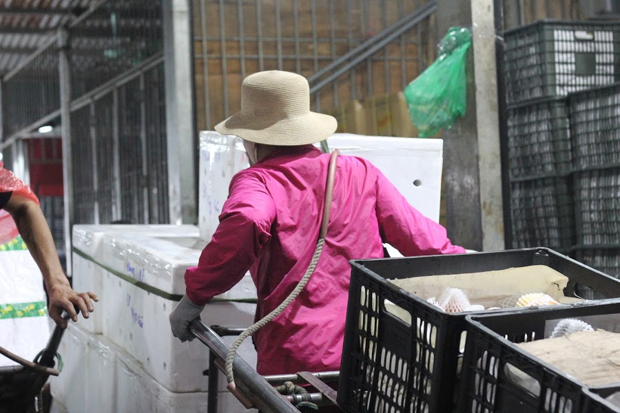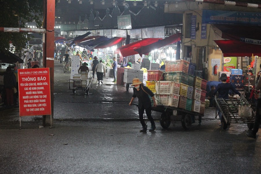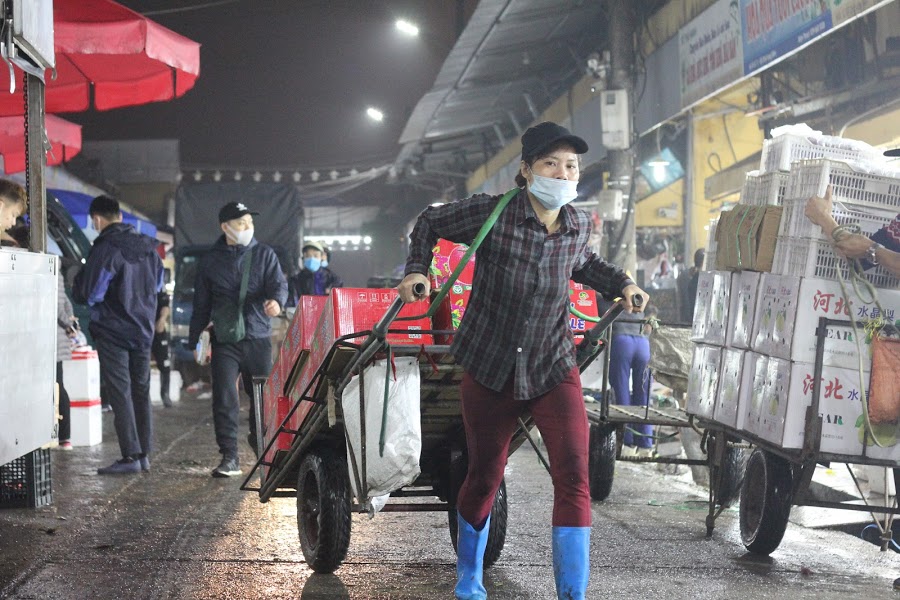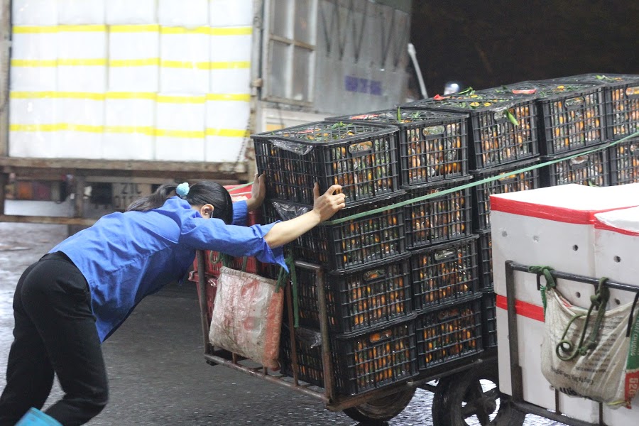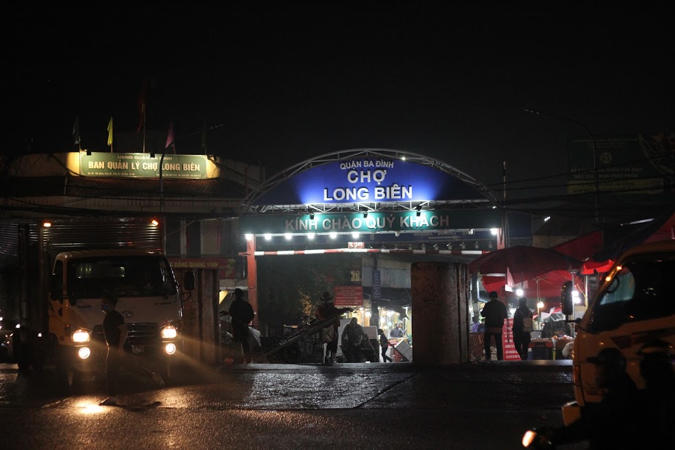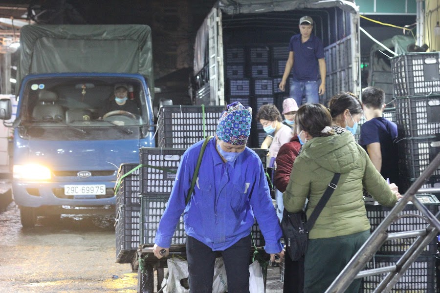 Không khí ở chợ đầu mối Long Biên nhộn nhịp từ 9h tối. Những chiếc xe tải chợ hàng hóa ra, vào nối đuôi nhau, tiểu thương đến lấy hàng và những cửu vạn tấp nập bắt đầu vận chuyển hàng qua lại.