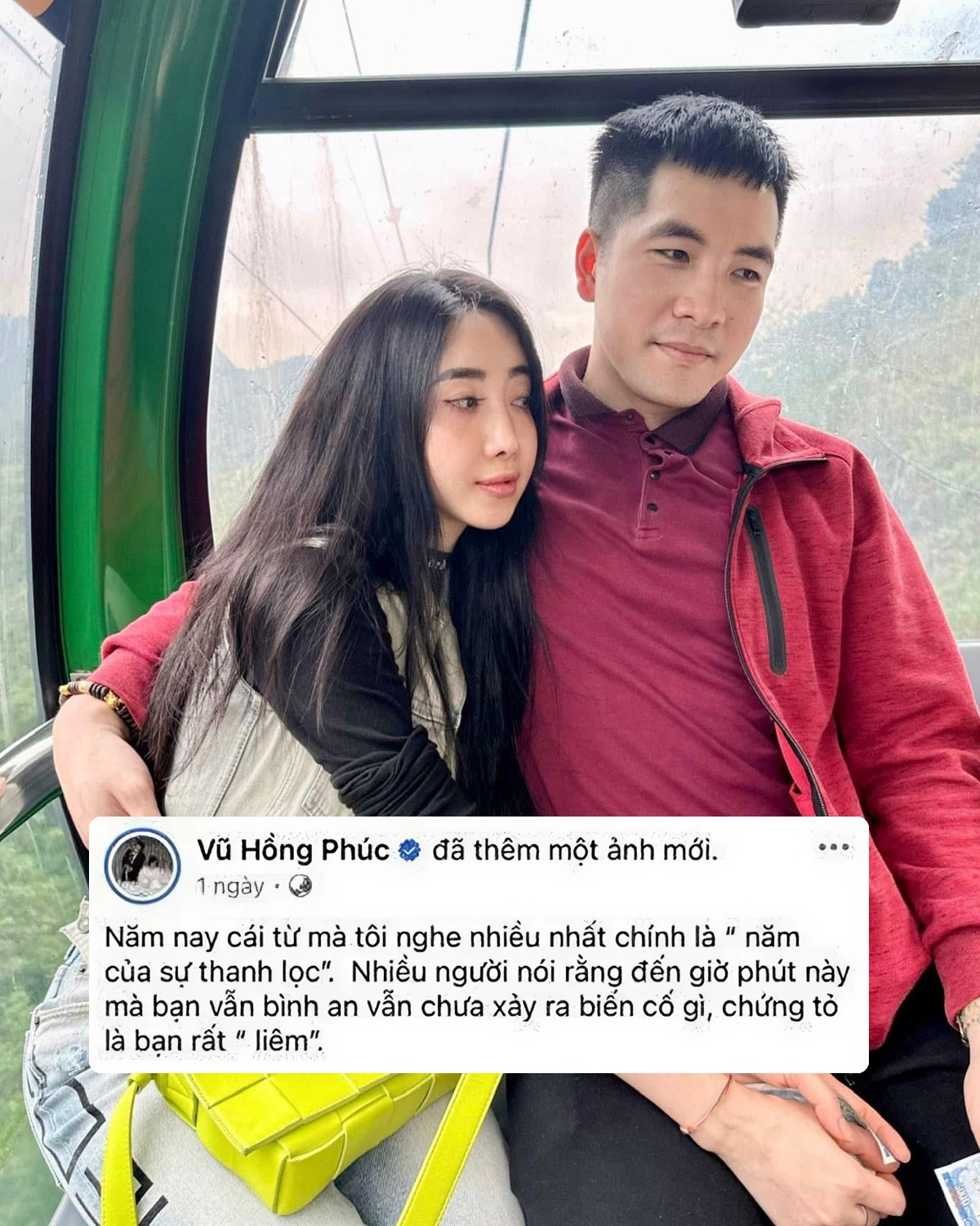 Từ hình ảnh cho thấy, Cún Bông và chồng đang đi cáp treo trong một chuyến du lịch. Nhưng gây chú ý hơn cả chính là dòng trạng thái "chưa gặp biến thời điểm này thì là liêm" của cô.