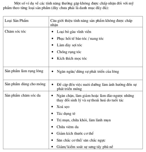 Thông tư 06/2011/TT-BYT - quy định về quản lý mỹ phẩm, cùng với hướng dẫn của ASEAN về công bố tính năng của sản phẩm mỹ phẩm thì, những từ dùng cho quảng cáo như: Săn chắc cơ thể/ săn chắc ngực; Trị mụn, chữa khỏi, làm lành mụn; Giảm/ kiểm soát sự sưng tấy phù nề; Loại bỏ/ giảm mỡ/ giảm béo; Diệt nấm; Diệt virus; Kích thích mọc tóc… không được chấp nhận dùng trong quảng cáo mỹ phẩm.