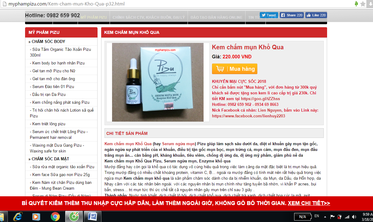 | Sản phẩm Kem chấm mụn Khổ qua, Serum mọc tóc Pizu vỏ cam vi phạm về tính năng quảng cáo theo hướng dẫn ASEAN về mỹ phẩm |