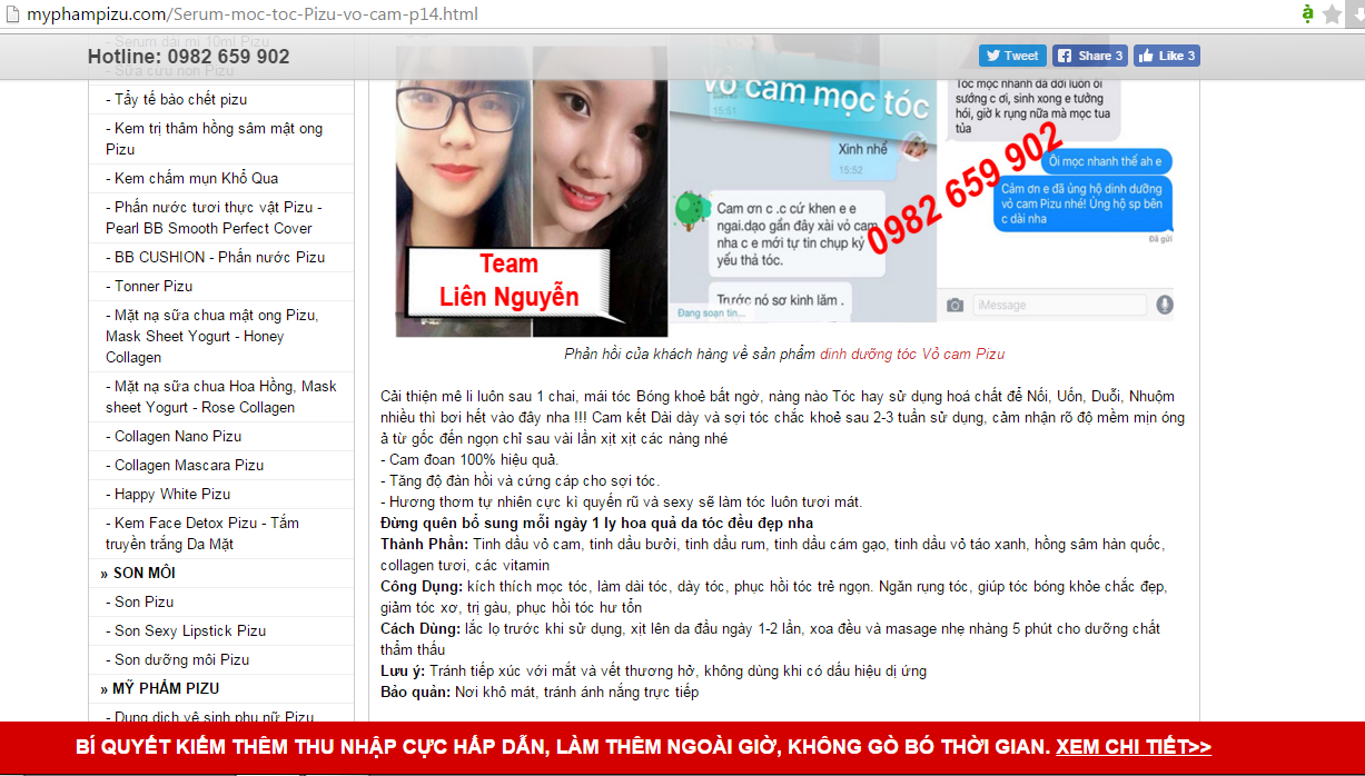 Tuy nhiên, trên website: myphampizu.com lại đang xảy ra tình trạng quảng cáo sản phẩm mỹ phẩm thêm nhiều công dụng đặc biệt so với Phiếu công bố của Sở Y tế Hà Nội cấp. Trang website này còn khẳng định, cam đoan sau khi sử dụng sản phẩm sẽ đạt hiệu quả 100%.
