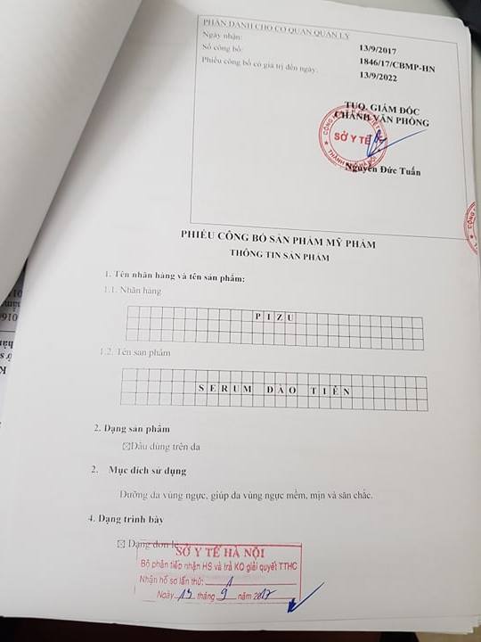 Cụ thể, sản phẩm Serum Đào tiên 01 Pizu quảng cáo: “làm căng đầy, tăng kích thước, săn chắc và chống chạy xệ vùng ngực, mở rộng mạng lưới dẫn mô mỡ và dây chằng xung quanh vòng 1, thúc đẩy nhanh hệ tuần hoàn, mở rộng cấu trúc tế bào của bộ ngực một cách đều đặn, đồng thời dưỡng sâu, làm mịn và dưỡng ẩm da vùng ngực”. Nhưng trong Phiếu Công bố sản phẩm mỹ phẩm Serum Đào tiên 01 Pizu đã bị thu hồi tiếp nhận phiếu công bố sản phẩm vào tháng 12.2017, nay có tên là Serum Đào tiên được Sở Y tế Hà Nội công nhận sản phẩm này chỉ là sản phẩm dưỡng da, giúp da vùng ngực mềm, mịn và săn chắc.