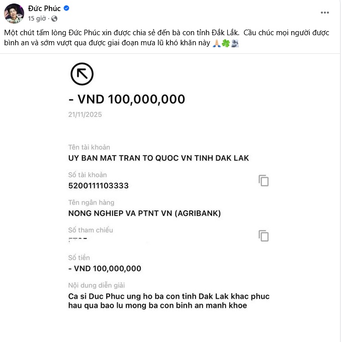 Anh viết: "Một chút tấm lòng Đức Phúc xin được chia sẻ đến bà con tỉnh Đắk Lắk. Cầu chúc mọi người được bình an và sớm vượt qua được giai đoạn mưa lũ khó khăn này."