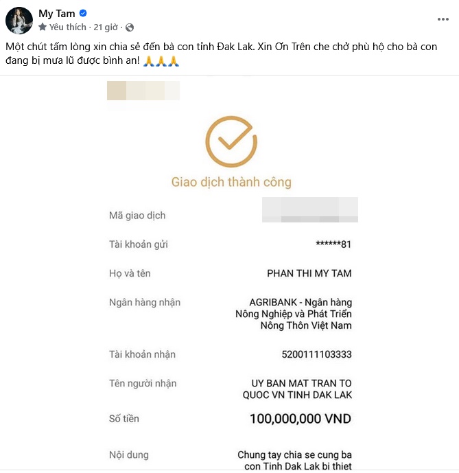 Mới nhất, Mỹ Tâm có hành động san sẻ giúp đỡ bà con vùng lũ. Theo đó, trên trang cá nhân, nữ ca sĩ đăng tải bức hình chuyển khoản 100 triệu đồng ủng hộ kèm dòng trạng thái: "Một chút tấm lòng xin chia sẻ đến bà con tỉnh Đắk Lắk. Xin Ơn Trên che chở phù hộ cho bà con đang bị mưa lũ được bình an."