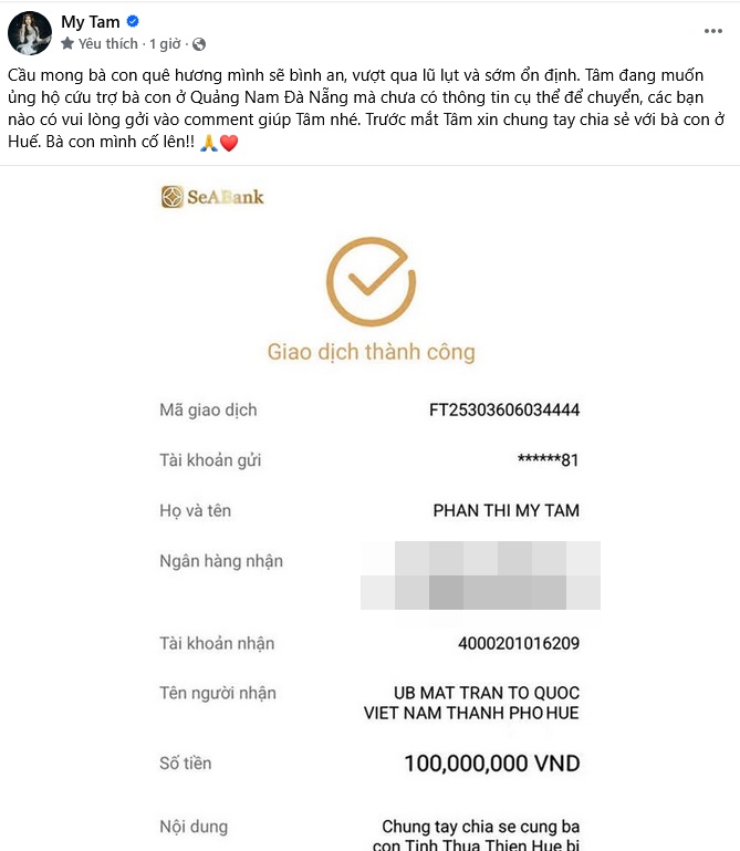 Kèm theo đó, giọng ca "Cây Đàn Sinh Viên" chia sẻ màn hình chuyển khoản 100 triệu đồng gửi bà con chịu ảnh hưởng bão lũ ở Huế. Người đẹp cũng tiết lộ muốn cứu trợ bà con ở Quang Nam, Đà Nẵng mà chưa có thông tin để chuyển tiền.