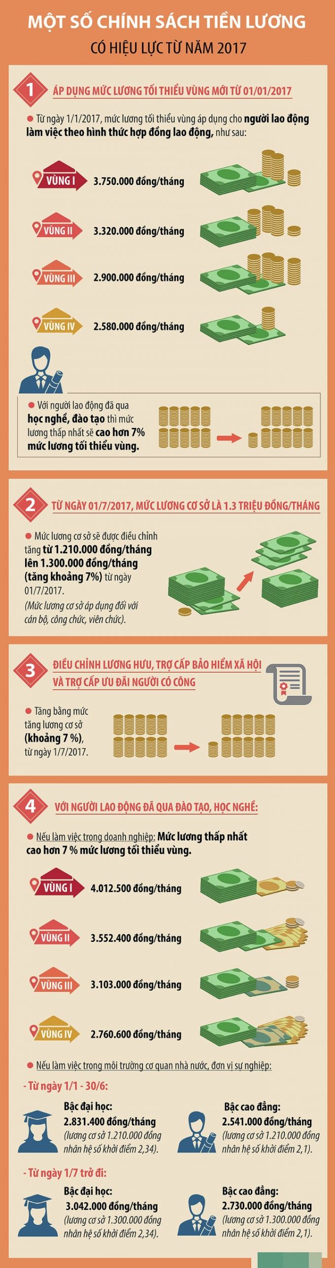Sang năm 2017: Lương tối thiểu vùng tăng thêm 7,3 %; lương cơ sở tăng từ 1.210.000 đồng/tháng lên 1.300.000 đồng/tháng; lương hưu và trợ cấp sẽ được tăng theo tuỳ nhóm đối tượng. Đồng thời, mức lương của nhóm lao động qua đào tạo, học nghề cũng được bổ sung...
