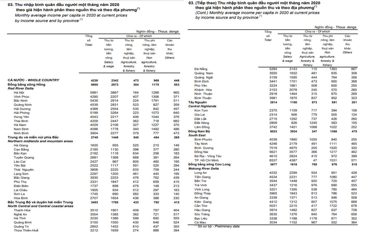 Tổng cục Thống kê công bố sơ bộ của Khảo sát mức sống dân cư năm 2020. Trong đó, thu nhập bình quân một người một tháng chung cả nước năm 2020 theo giá hiện hành giảm nhẹ so với năm 2019.
