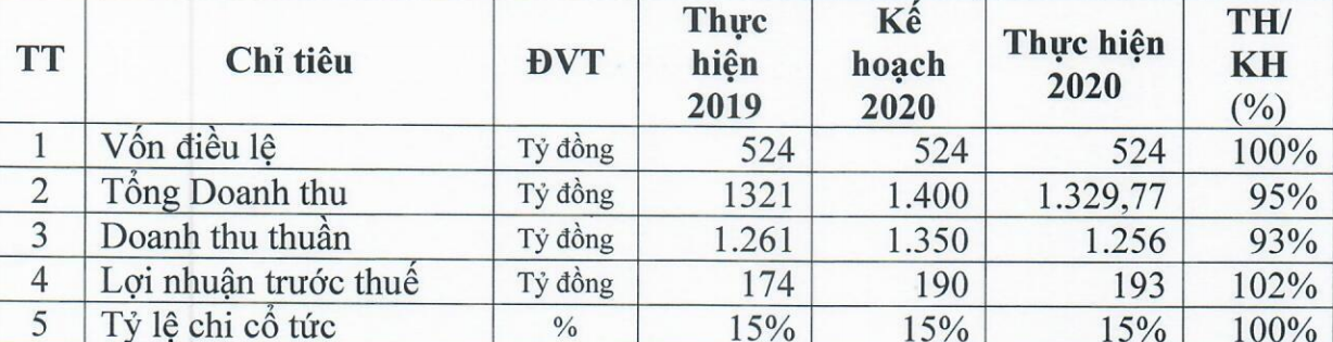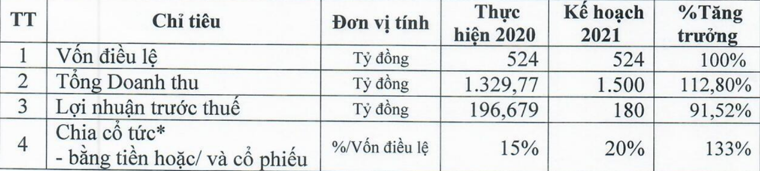 Theo đó, Công ty đặt ra kế hoạch sản xuất kinh doanh năm 2021 đạt 1.500 tỷ đồng, tăng 12,8% so với thực hiện năm 2020. Lợi nhuận trước thuế dự kiến đạt 180 tỷ đồng, giảm 8,5%. Kế hoạch chia cổ tức 20% bằng tiền hoặc cổ phiếu, trong khi năm 2019 là 15%.