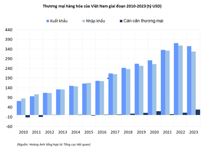 Năm 2023, tổng kim ngạch xuất, nhập khẩu hàng hóa ước đạt 683 tỷ USD, trong đó xuất khẩu đạt 355,5 tỷ USD, nhập khẩu khoảng 327,5 tỷ USD. Như vậy, năm 2023 cán cân thương mại hàng hóa ước tính xuất siêu 28 tỷ USD, gấp 2,2 lần năm 2022.