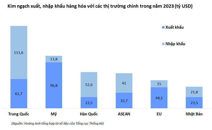 Năm 2023, Mỹ là thị trường xuất khẩu lớn nhất của Việt Nam với kim ngạch ước đạt 96,8 tỷ USD. Trung Quốc là thị trường nhập khẩu lớn nhất của Việt Nam với kim ngạch ước đạt 111,6 tỷ USD.