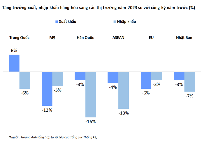 Ở chiều ngược lại, Việt Nam nhập siêu từ Trung Quốc gần 50 tỷ USD, giảm 18%; nhập siêu từ Hàn Quốc 29,1 tỷ USD, giảm 23%; nhập siêu từ ASEAN 8,3 tỷ USD, giảm 37%.