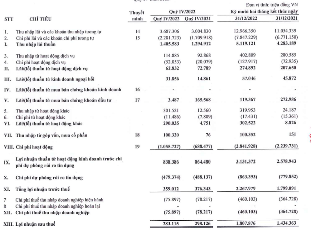 Trong kỳ, thu nhập lãi thuần của ngân hàng tăng 8,5% lên 1.405 tỷ đồng, lãi thuần từ kinh doanh ngoại hối tăng gấp đôi lên 31,8 tỷ đồng. Lãi thuần từ hoạt động kinh doanh khác tăng gấp 72 lần lên 290 tỷ đồng.