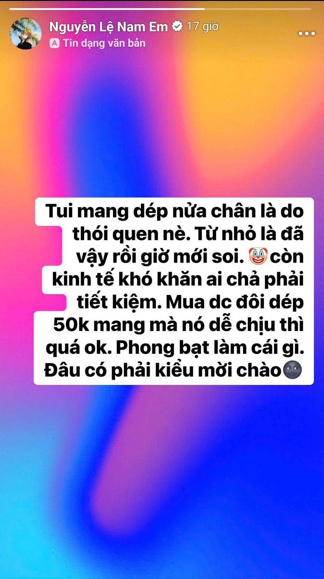 Mới đây, Nam Em gây chú ý khi tiếp tục có phát ngôn cực gắt trên mạng xã hội. Nguồn cơn bắt đầu từ việc, một số cư dân mạng "soi" thói quen đi dép nửa chân của người đẹp. Chia sẻ dòng trạng thái, cô thật thà cho biết đó là thói quen từ ngày bé, cộng với việc kinh tế khó khăn nên không có nhu cầu sống ảo, mua đôi dép 50K đi vào chân thấy dễ chịu là được.