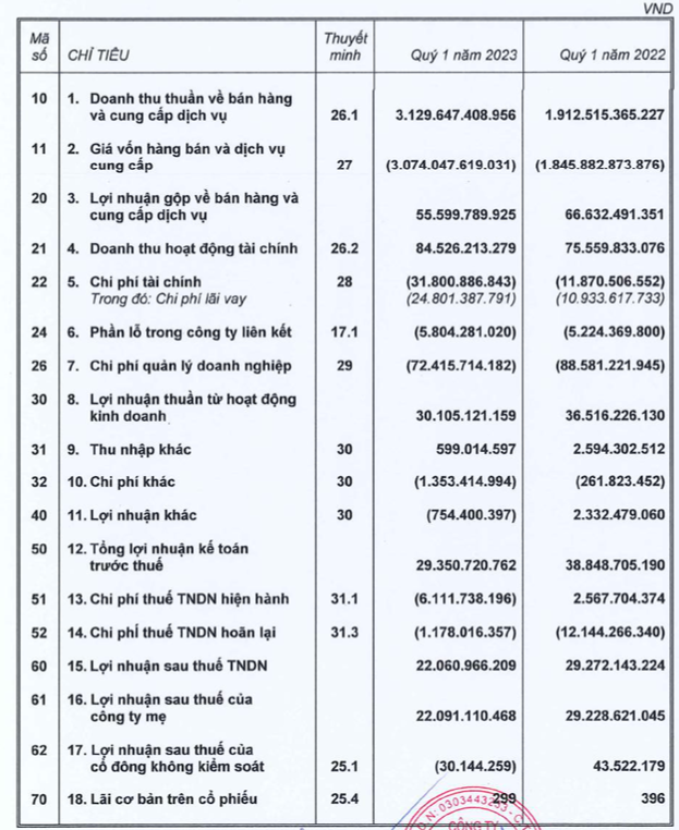 Doanh thu tài chính tăng 12% lên 85 tỷ đồng nhờ lãi tiền gửi ngân hàng Trong khi đó, chi phí tài chính tăng tới 167% lên 32 tỷ đồng do chi phí lãi vay tăng cao cộng thêm khoản lỗ từ đầu tư chứng khoán hơn 6 tỷ đồng, cùng kỳ năm trước không ghi nhận lỗ từ nghiệp vụ này.