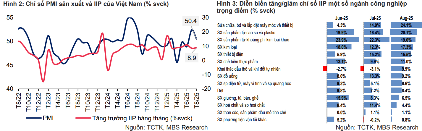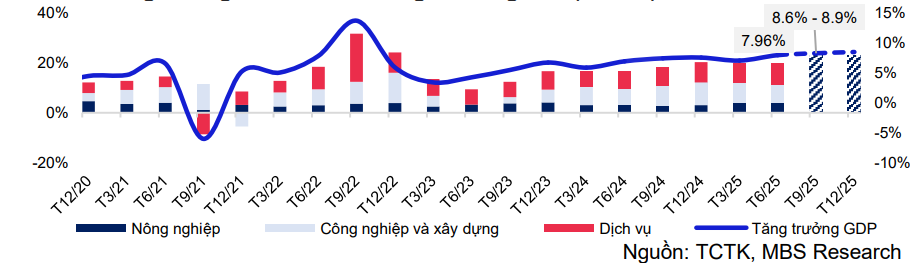 Chính phủ đã nâng mục tiêu tăng trưởng GDP 2025 lên 8,3 – 8,5%. Với đà hiện tại, MBS Research dự báo GDP quý III tăng 8,6 – 8,9%, đưa cả năm tiệm cận mục tiêu. Điều này đồng nghĩa Việt Nam có thể duy trì vị thế một trong những nền kinh tế tăng trưởng nhanh nhất khu vực, bất chấp những bất định từ bên ngoài.