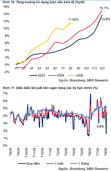 Trên thị trường tài chính, đến cuối tháng 8, tín dụng toàn hệ thống tăng 11,8% so với cuối năm 2024, tương đương +20,6% so với cùng kỳ – mức cao so với trung bình nhiều năm. Đáng chú ý, lãi suất huy động vẫn ổn định, ở mức 4,7 – 4,9% cho kỳ hạn 12 tháng, nhờ thanh khoản hệ thống dồi dào.