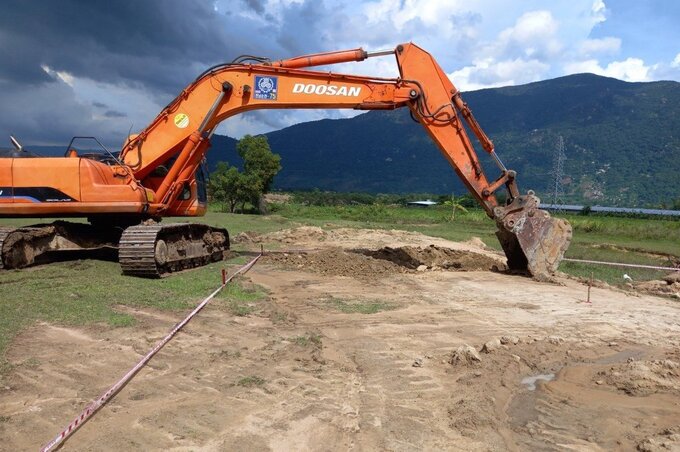 Vị trí móng 213 đường dây 500 kV Vân Phong - Vĩnh Tân được các nhà thầu thi công. Ảnh: EVNNPT