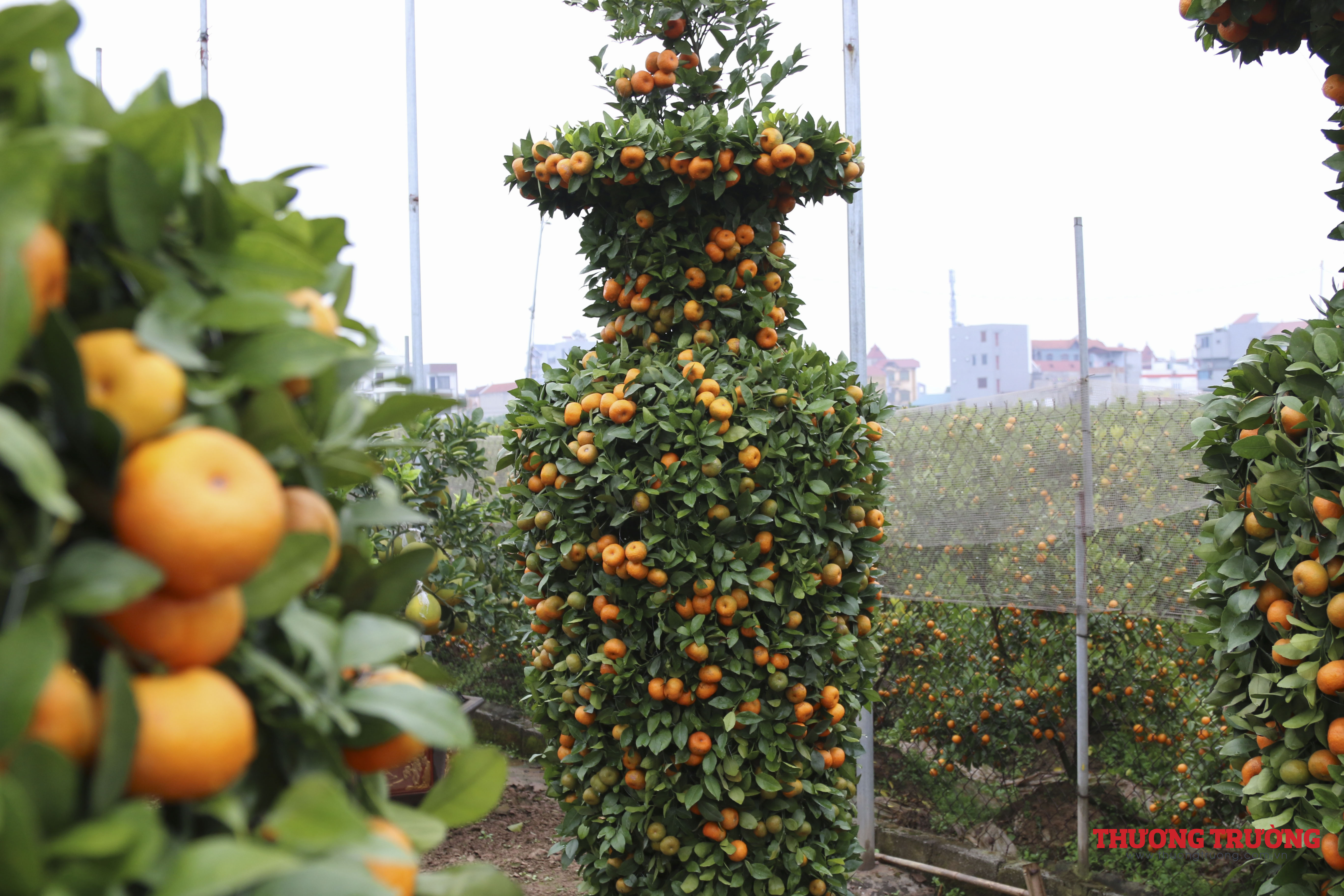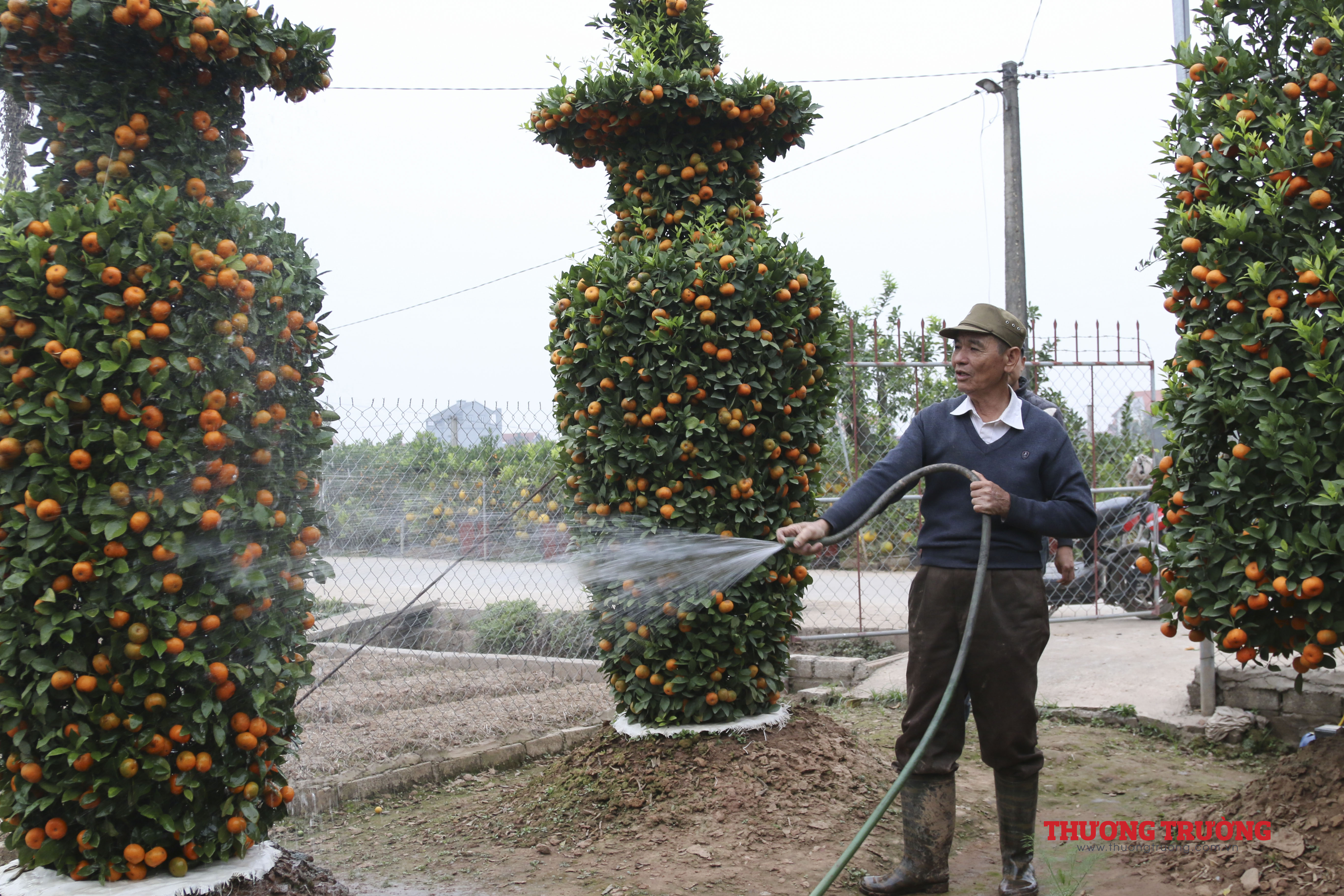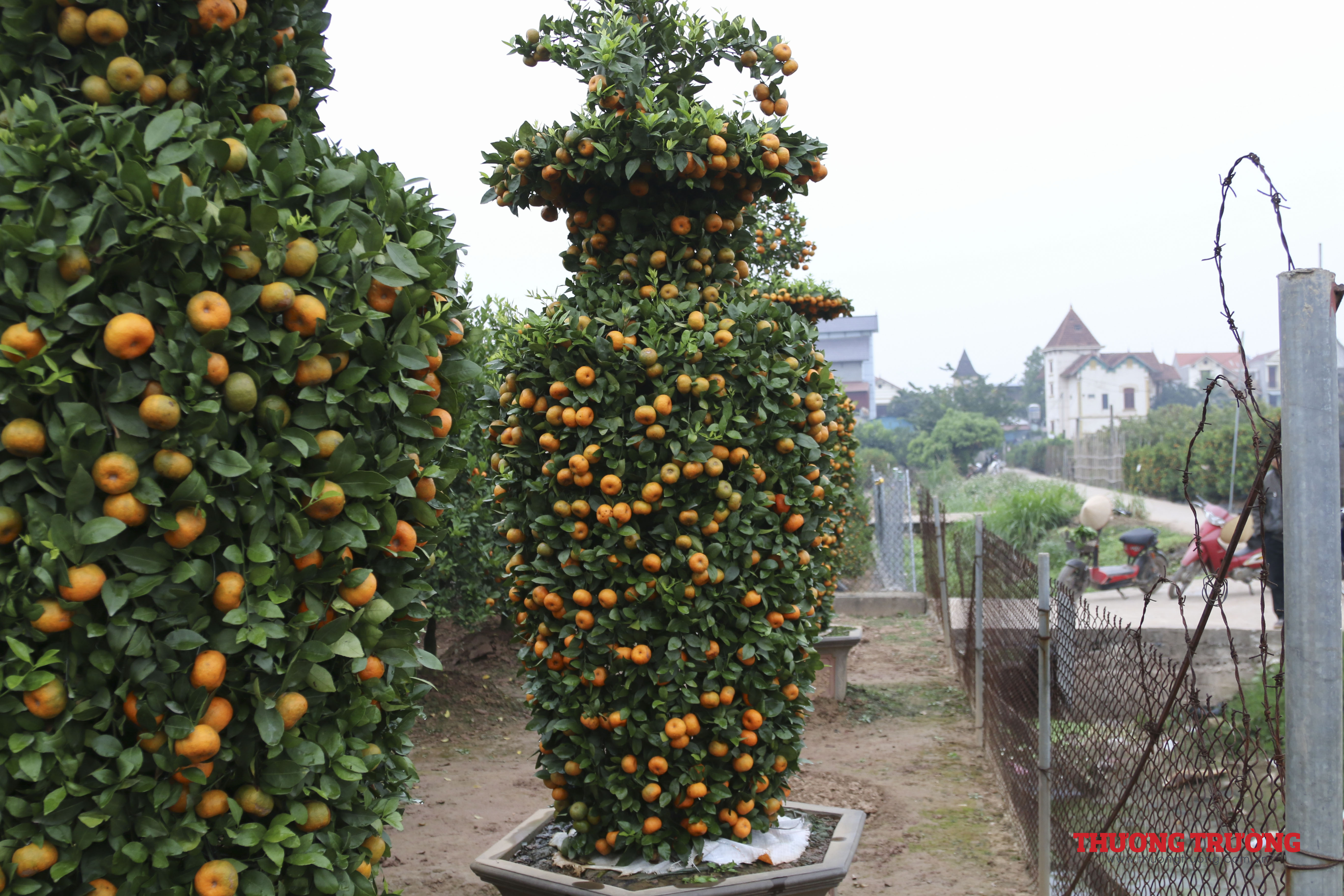 Tất cả các cây đều được ông căng rào thép gai cận thận. Trong vườn nhà ông Thành cũng có rất nhiều cây quýt được gò theo hình tháp, phục vụ người dân chơi tết.