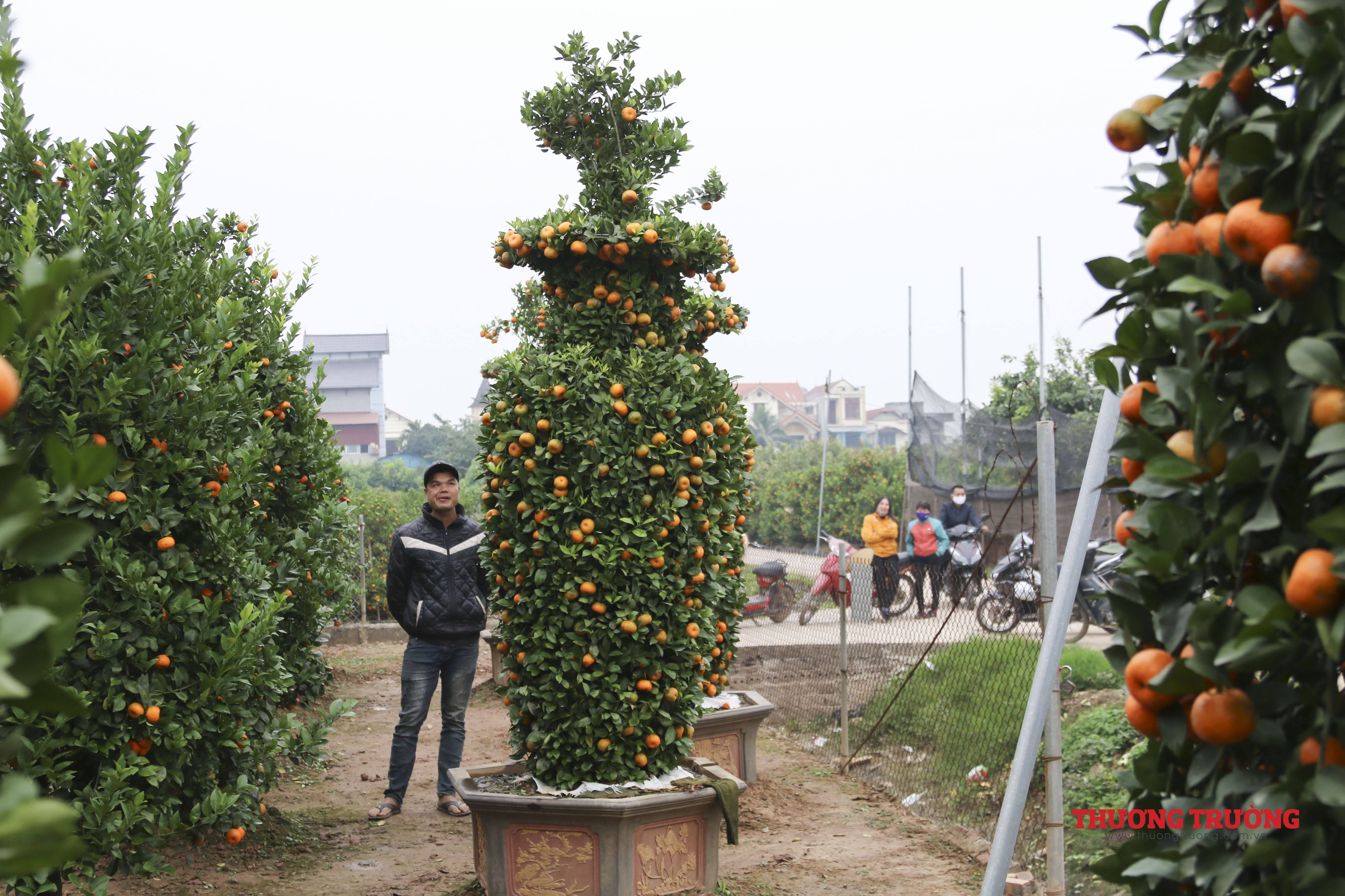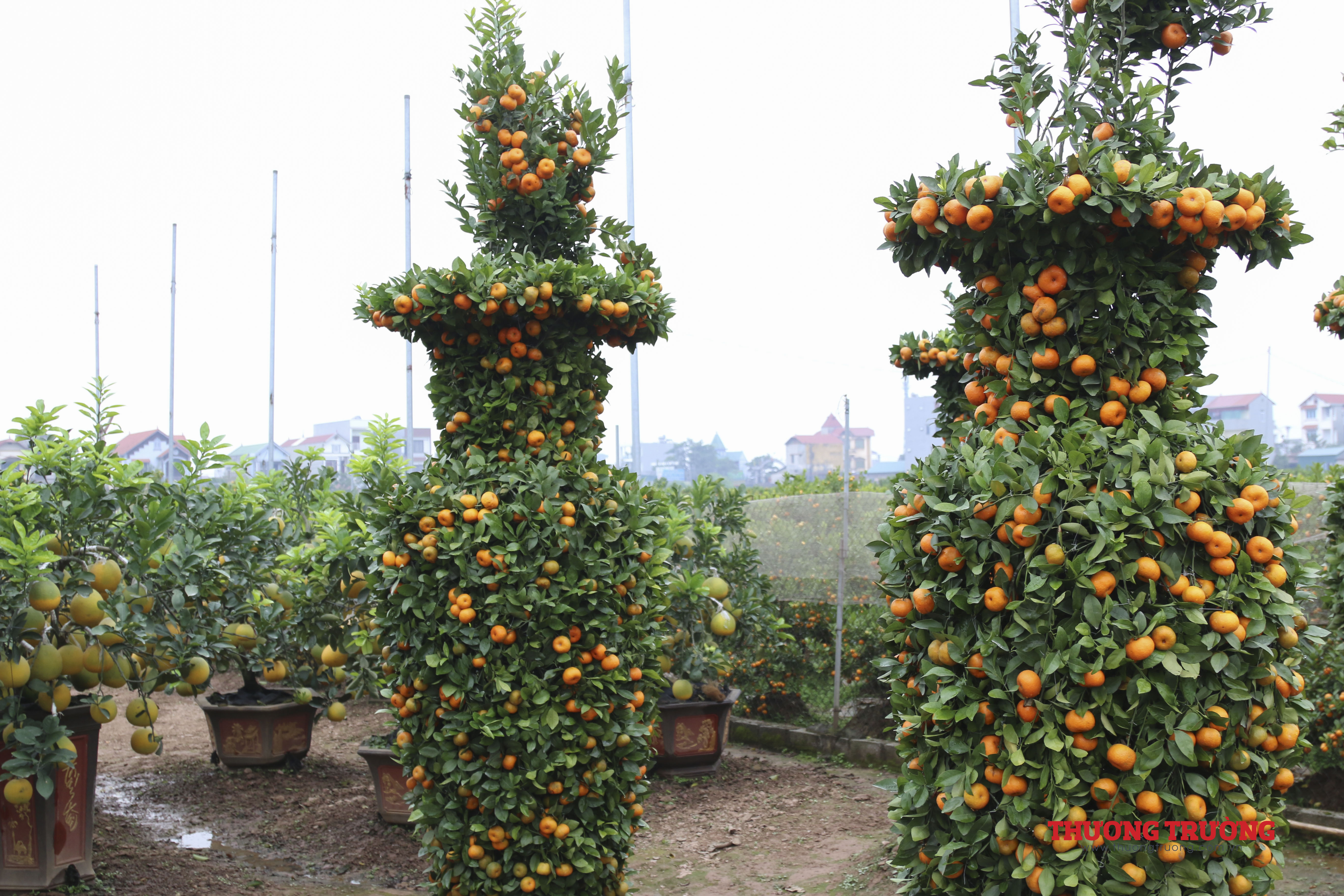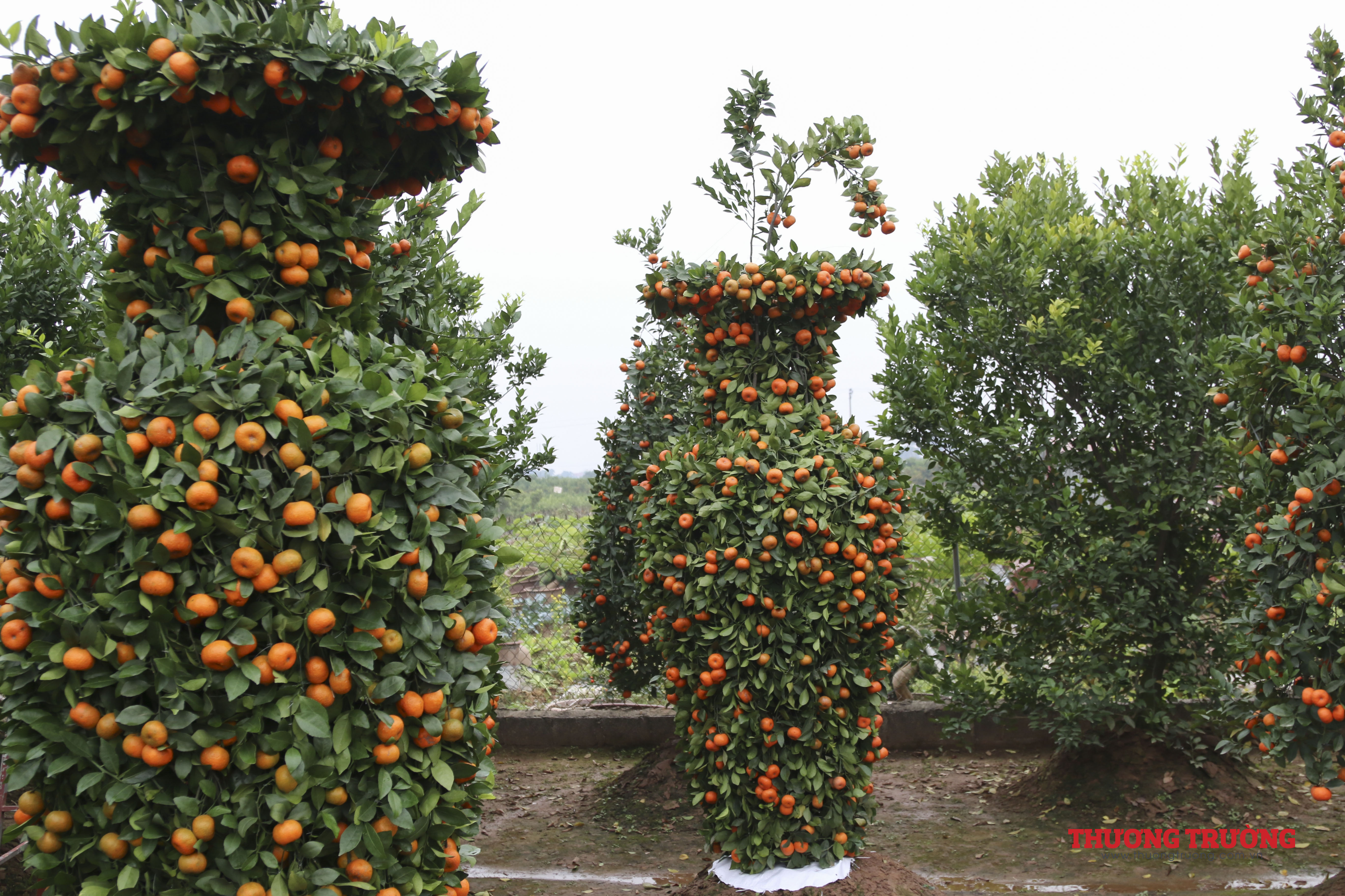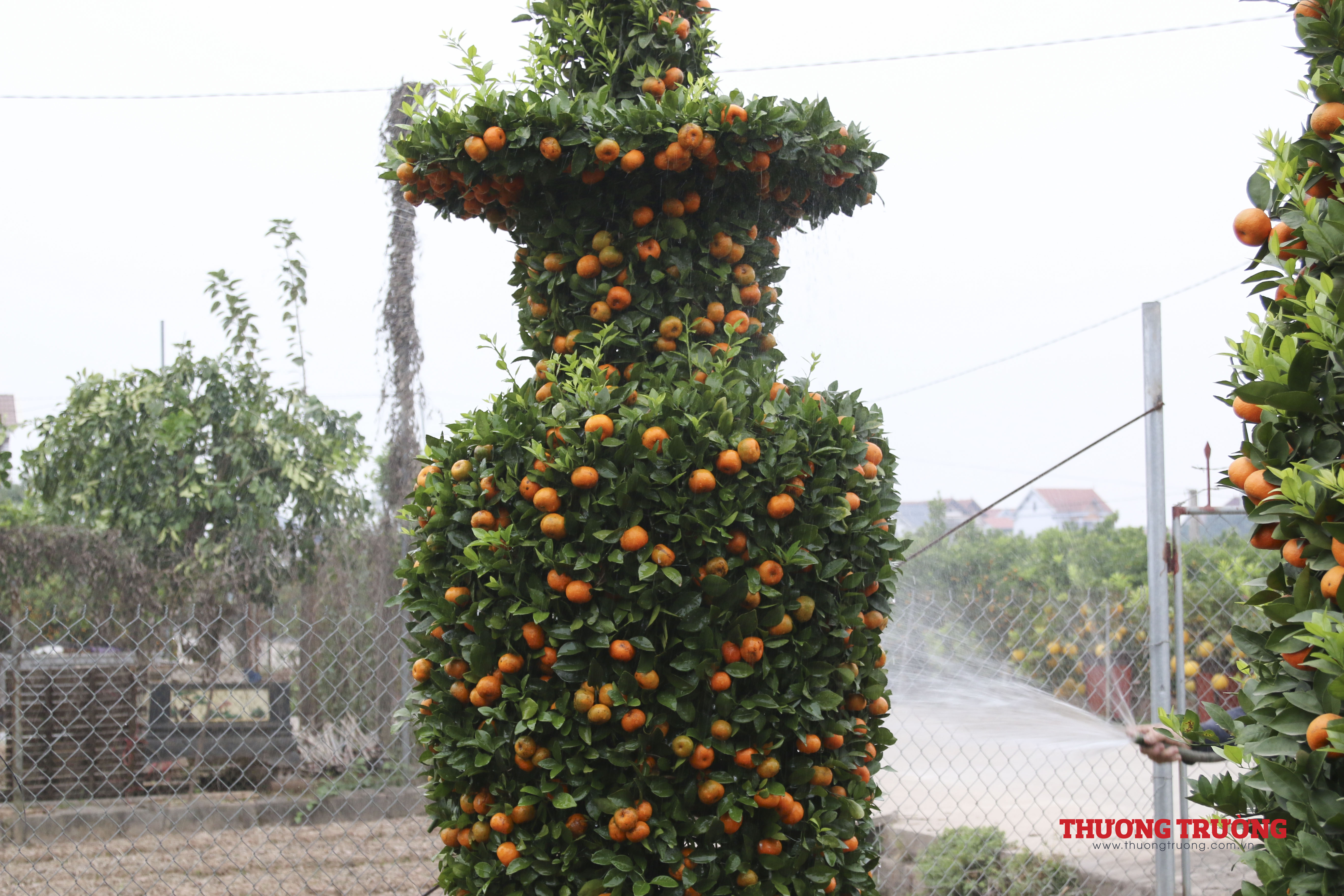 Tất cả các cây đều được ông căng rào thép gai cận thận. Trong vườn nhà ông Thành cũng có rất nhiều cây quýt được gò theo hình tháp, phục vụ người dân chơi tết.