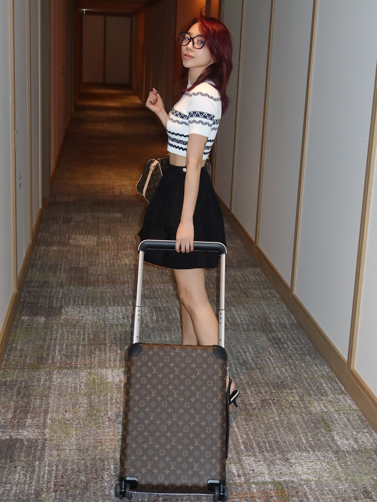 Chẳng cần cầu kì, bà xã Hoàng Touliver diện áo họa tiết phối với chân váy chữ A hack tuổi. Người đẹp phối cùng phụ kiện kính mắt và túi xách, vali của thương hiệu Louis Vuitton. Outfit tuy tối giản nhưng bóc giá khiến nhiều người phải choáng váng.