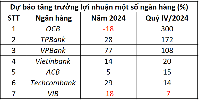 VCBS đưa ra dự báo lạc quan hơn, cho rằng lợi nhuận của VietinBank có thể tăng 15%, trong khi lợi nhuận của các ngân hàng khác như MB, ACB, MSB, HDBank, Techcombank, và VIB có thể tăng từ 20-26%. Đặc biệt, lợi nhuận của Sacombank dự báo sẽ tăng tới 32%.