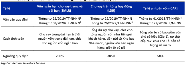 Ngân hàng Nhà nước (NHNN) yêu cầu các ngân hàng duy trì một số tỷ lệ an toàn tài chính như vốn ngắn hạn cho vay trung dài hạn (SMLR), cho vay trên tiền gửi (LDR) và tỷ lệ an toàn vốn (CAR) trong ngưỡng quy định.