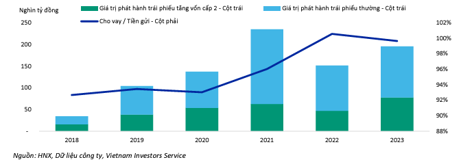 Trong báo cáo ngành ngân hàng mới đây, CTCP Xếp hạng Tín nhiệm Đầu tư Việt Nam (VIS Rating) cho biết tăng trưởng tiền gửi chậm lại do điều kiện hoạt động kinh doanh suy giảm trong giai đoạn 2021-2022 đã thúc đẩy hoạt động huy động vốn trái phiếu để hỗ trợ tăng trưởng tín dụng. Tỷ lệ cho vay trên tiền gửi của ngành ngân hàng tăng mạnh và đạt đỉnh ở mức 101% do huy động tiền gửi cá nhân và doanh nghiệp gặp khó khăn.