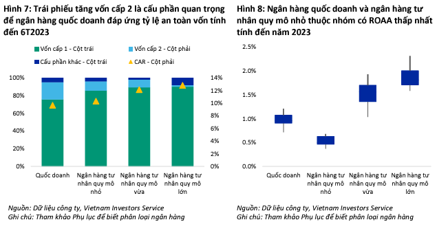Nhóm ngân hàng quốc doanh và ngân hàng tư nhân quy mô nhỏ sử dụng nhiều trái phiếu tăng vốn cấp 2 hơn trong cơ cấu vốn tự có, để bổ sung mức vốn cấp 1 thấp và đáp ứng quy định về tỷ lệ an toàn vốn. Tỷ suất lợi nhuận trên tổng tài sản bình quân thấp cùng với việc trả cổ tức tiền mặt thường xuyên đã hạn chế khả năng tạo vốn cấp 1 mới để hỗ trợ tăng trưởng tín dụng.