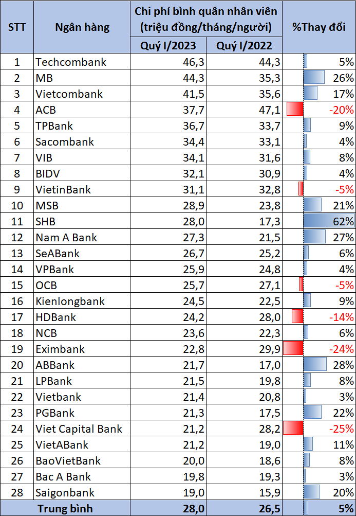 Đầu năm 2023, số liệu thống kê từ báo cáo tài chính hợp nhất của 28 ngân hàng cho thấy, chi phí bình quân hàng tháng của các ngân hàng chi cho nhân viên là 28 triệu đồng, tăng 5% so với cùng kỳ năm ngoái.