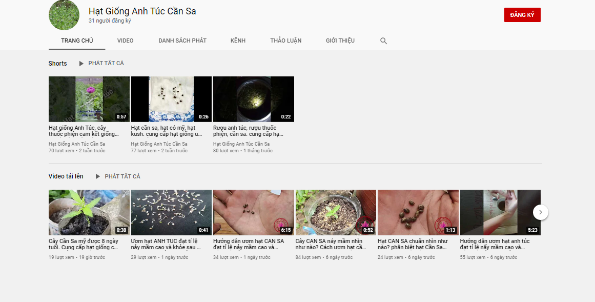 Cũng trên kênh Youtube có địa chỉ “Hạt Giống Anh Túc Cần Sa” xuất hiện nhiều clip quay quảng cáo về hạt giống cây anh túc, nhiều clip có tựa đề như “Hạt giống Anh Túc, cây thuốc phiện cam kết giống chuẩn, tỉ lệ nảy mầm cao”; “Hạt cần sa, hạt cỏ mỹ, hạt kush, cung cấp hạt giống uy tín chất lượng”; “Hướng dẫn ươm hạt CẦN SA đạt tỉ lệ nảy mầm cao và nhanh nhất”…