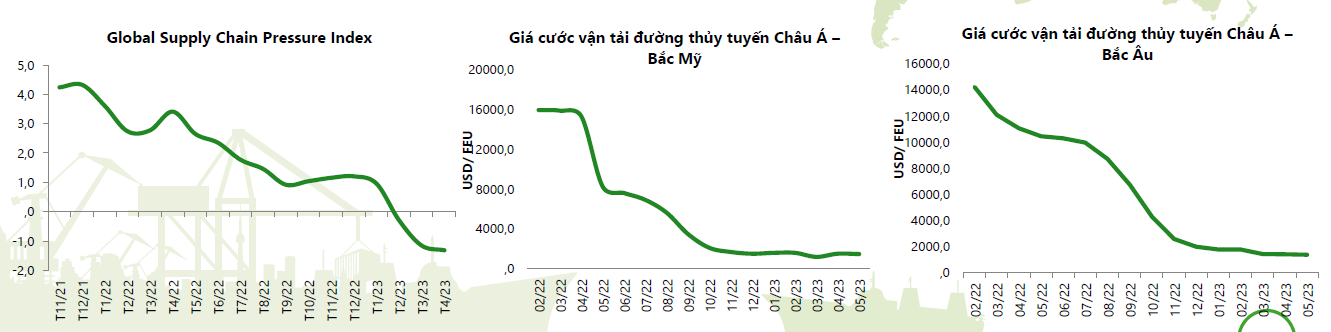 Bên cạnh đó, hiện tượng tắc nghẽn cảng đã được giải tỏa dần từ tháng 1/2023, chỉ số GSCPI (đo lường áp lực đứt gãy chuỗi cung ứng) đã giảm về mức -1,32. Tỷ lệ lấp đầy tại các cảng ở Bắc Mỹ và Bắc Âu duy trì ở mức 10-85%, không còn bị tắc nghẽn như đợt cuối năm 2022.
