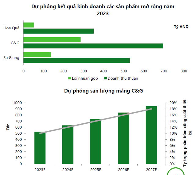Với mảng gạo, sau khi dự án xí nghiệp Sa Giang 3 hoàn thành, Sa Giang đã tận dụng thương hiệu của mình để nâng cao sản lượng tiêu thụ ở cả thị trường xuất khẩu và nội địa. Ban lãnh đạo VHC đưa ra kế hoạch cho năm 2023 với mức doanh thu tăng 2,5 lần lên 680 tỷ đồng. Tuy nhiên, với tình hình chi phí nguyên vật liệu đầu vào đang ở mức cao, chưa ổn định, cùng ảnh hưởng của lạm phát đến sức mua của các thị trường, VCBS đưa ra mức dự phóng thận trọng cho doanh thu thuần và lợi nhuận gộp từ Sa Giang đạt lần lượt là 530 và 138 tỷ VND cho năm nay.