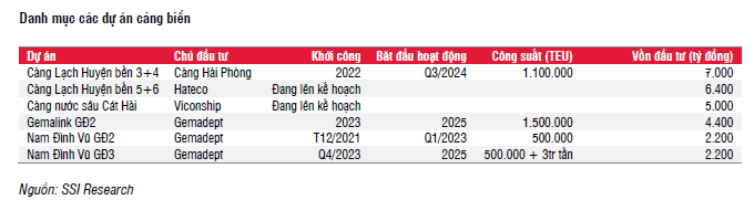 SSI Research lưu ý rằng, các công ty trong ngành đang thực hiện nhiều dự án mới như PHP (Cầu cảng 3+4 tại cảng nước sâu Lạch Huyện), GMD (Gemalink GĐ 2, Cảng Nam Đình Vũ GĐ 2+3), VSC (cảng nước sâu Cát Hải), HAH (4 tàu đóng mới) và dự án Cái Mép Hạ (đang chờ phê duyệt). Các dự án này được kỳ vọng sẽ củng cố mạng lưới của các công ty logistic để thích nghi với xu hướng tăng kích cỡ tàu và tăng hiệu quả sử dụng tàu.