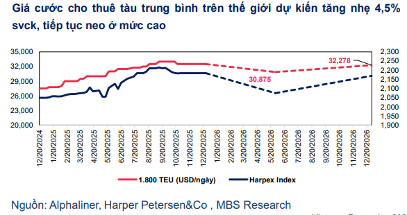 MBS nhận định giá cước thuê tàu trung bình toàn cầu sẽ tiếp tục tăng nhẹ và duy trì ở mức cao trong năm 2026. Các hãng tàu có xu hướng ưu tiên sự ổn định, mức độ tin cậy của dịch vụ và khả năng hoạt động bền vững của đội tàu, đặc biệt trong bối cảnh tình hình thế giới biến động phức tạp, khó lường, thách thức nhiều hơn cơ hội. Do những rủi ro về bất ổn địa chính trị và căng thẳng thương mại gia tăng trở lại, các hãng tàu lớn có tần suất lựa chọn các hợp đồng thuê tàu thời hạn dài hơn, như một biện pháp phòng ngừa những rủi ro trong ngắn hạn, và chấp nhận chốt giá thuê cao hơn giá cước vận chuyển giao ngay trên thị trường.