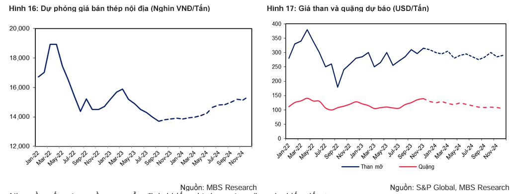 MBS lưu ý rằng, giá than và quặng có xu hướng tăng kể từ đầu T9/2023 trong bối cảnh các nhà máy sản xuất thép tại TQ tăng cường tích trữ tồn kho trước khi phải thực hiện chính sách cắt giảm giảm sản lượng trong năm 2024. Nguồn cung quặng sắt sang 2024 tiếp tục được cải thiện khi sản lượng tại Úc (chiếm 35% nguồn cung toàn cầu) được dự báo tăng 2.9% so với cùng kỳ lên mức 1.01 tỷ tấn theo dự báo của Bộ Công Nghiệp - Khoa học nước này.