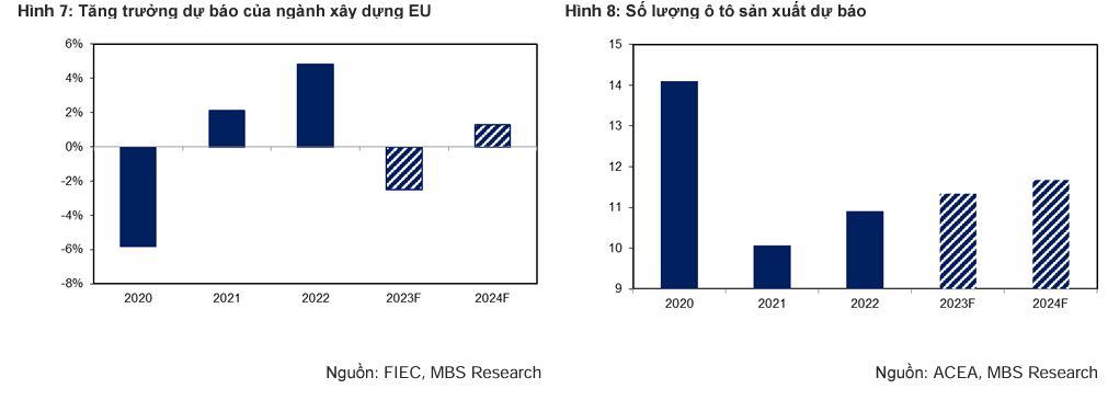 Trong Báo cáo của Hiệp Hội thép Châu Âu (Eurofer), nhu cầu thép tại EU sẽ giảm 3% so với cùng kỳ vào 2023. Nhu cầu ở mức thấp khi các ngành tiêu thụ thép lớn như xây dựng (35%) và sản xuất ô tô (18%) bị ảnh hưởng bởi chính sách thắt chặt tại EU. Theo dự báo của Hiệp Hội Xây dựng Châu Âu (FIEC), tổng vốn đầu tư xây dựng dự kiến giảm 2.5% so với cùng kỳ vào 2023 trong bối cảnh lãi suất cao tác động đến nhu cầu bất động sản.
