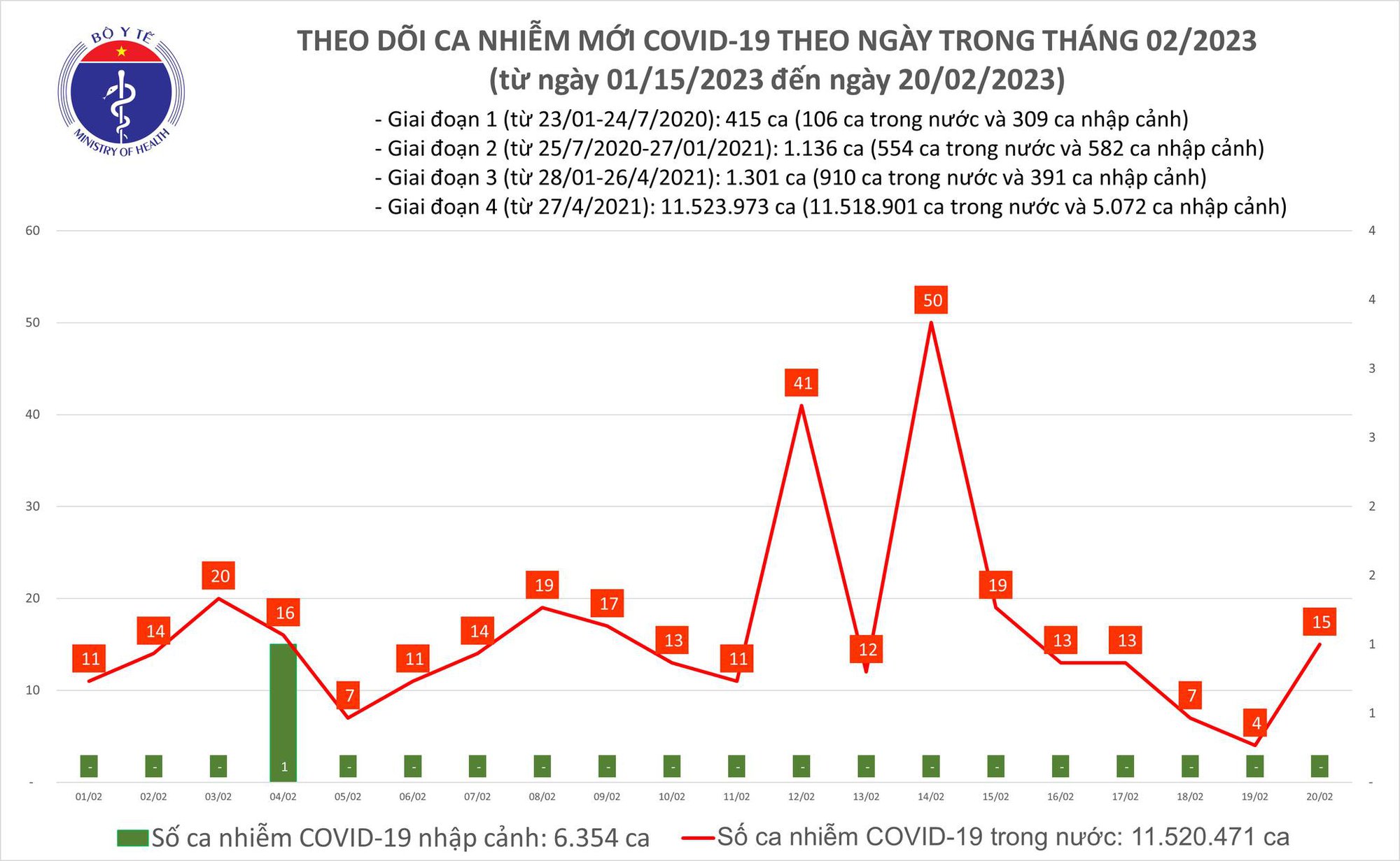 Ngày 20/2 của Bộ Y tế cho biết, có 15 ca mắc mới COVID-19, tăng gấp gần 4 lần ngày trước đó. Trong ngày không có bệnh nhân nào khỏi bệnh.