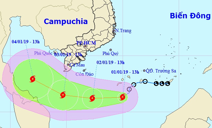 Chiều 1/1, áp thấp nhiệt đới đã mạnh lên thành bão số 1 năm 2019 với tên quốc tế là Pabuk. 16h cùng ngày, tâm bão cách đất liền các tỉnh Nam Bộ 500 km và cách Côn Đảo 430 km.