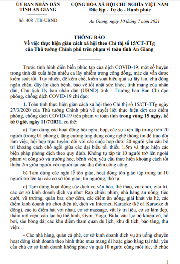 Mới đây, chủ tịch UBND tỉnh An Giang Nguyễn Thanh Bình đã ký Thông báo số 408 về việc thực hiện giãn cách xã hội theo chỉ thị số 15 trên phạm vi toàn tỉnh trong vòng 15 ngày, kể từ 0h ngày 11/7 để tập trung phòng chống và ngăn chặn dịch.